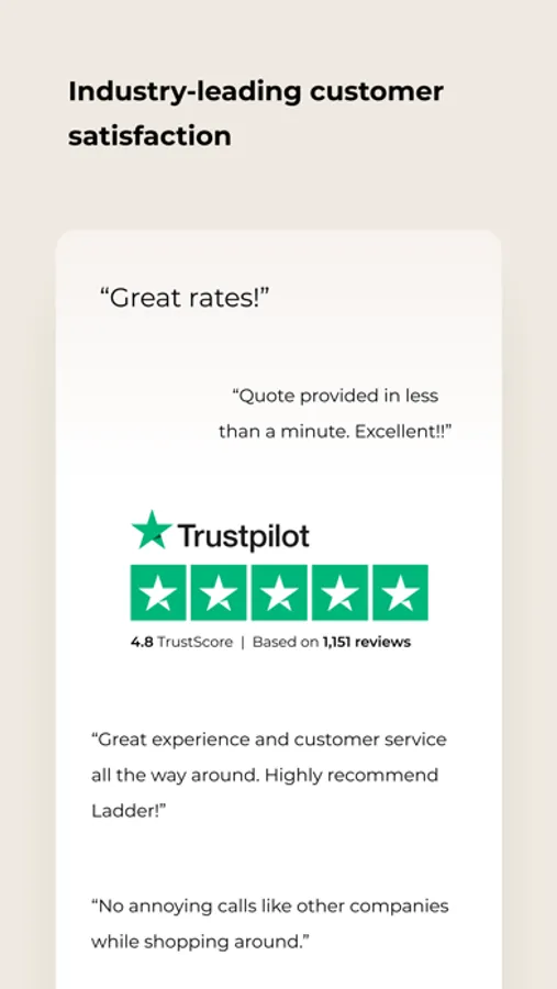 Ladder offers term life insurance from your phone. Get a free price estimate in under two minutes, use our coverage calculator, or apply for coverage and activate your policy right away. We’ve made it easy to apply for life insurance from a reputable company — and, thanks to our real-time underwriting and Apple Health integration, we’ve made it fast, too. You could earn cash by referring your friends.