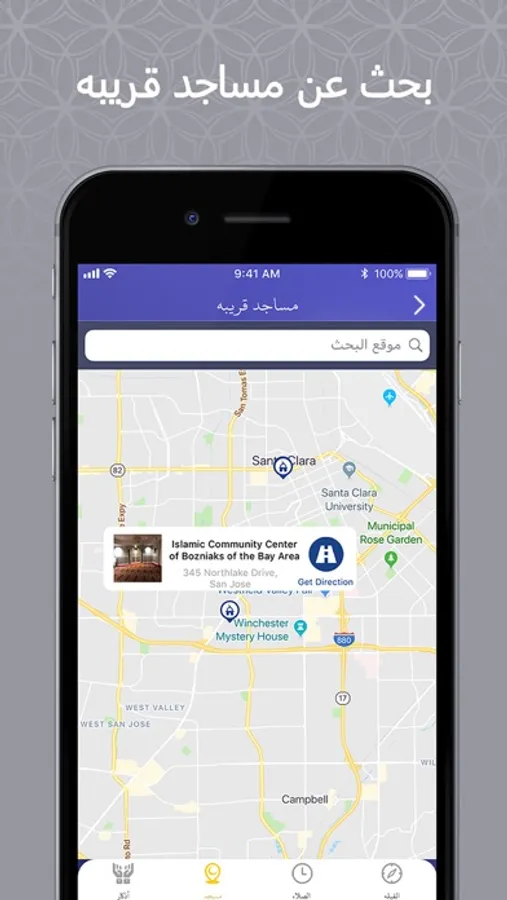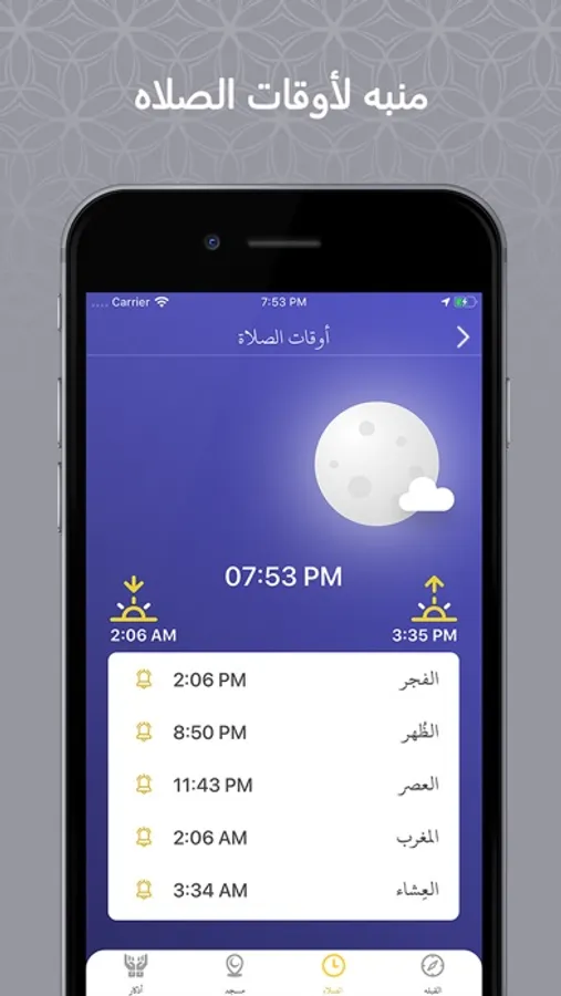 يمكنك ضبط تنبيهات للصلوات الخمس حسب المواقيت الصحيحة في موقعك وأيضًا تنبيهات خاصه بالأذكار