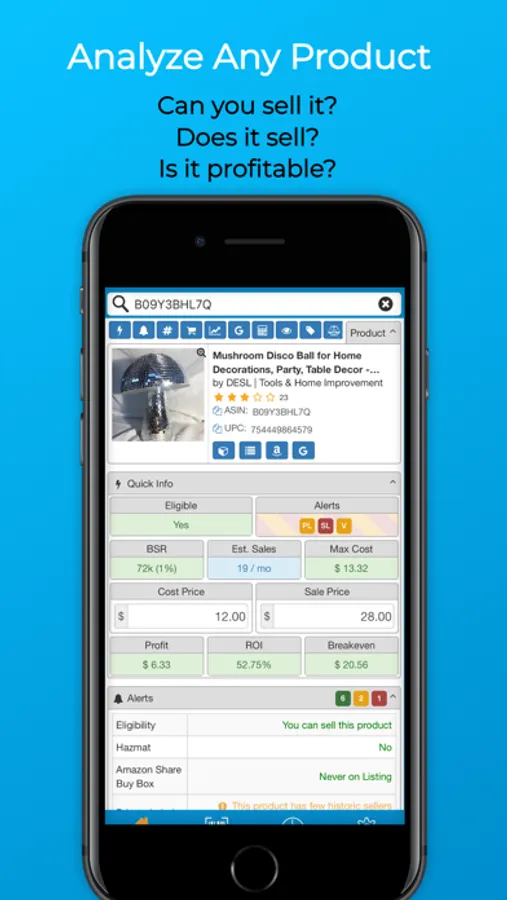 - Instantly calculate ROI, profit, profit margin, break even sale price, etc.