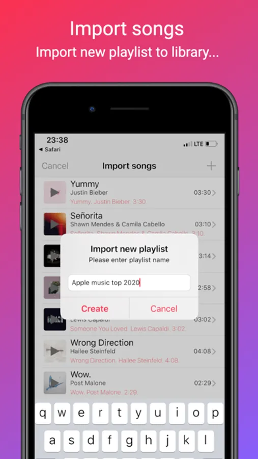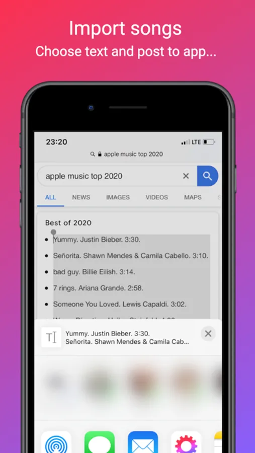 If you have an Apple Music subscription and need to add lots of songs, use the feature to import songs into Music. Songs can be imported from selected text from any application using the Share function. Or from a text file (.txt extension) in any of your applications.