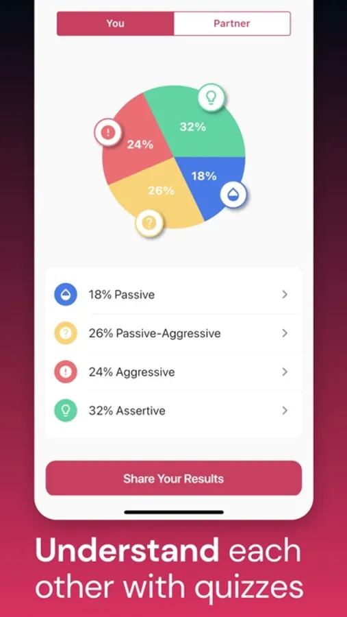We use quizzes with decades of research to help you understand each other. Learn about you and your partner's Love Style, Turn Ons, Attachment Style, Enneagram number and now – the Couply 16 Personality Types built on the work by Katharine Cook Briggs, Isabel Briggs Myers, and Carl Jung. Understand how this all can affect your relationship and what you can do about it!