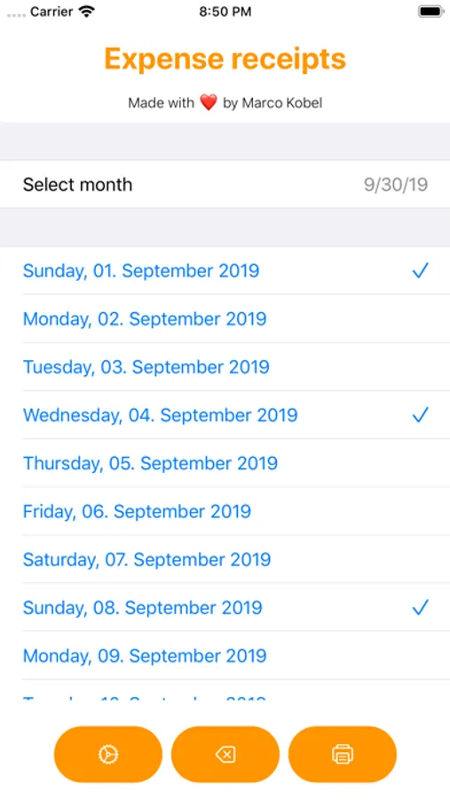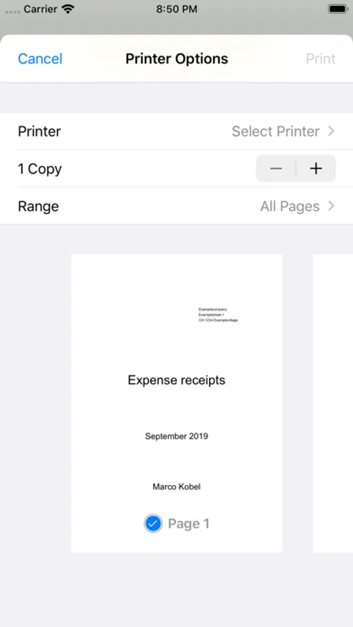 Paper expense receipts should be kept for several years for auditing purposes. With this app, a cover sheet can be printed for each month and a separate sheet for each day, to which the original receipts can be attached. This will keep your filing system in order. So that the original receipts can be sent by mail to a central location in your company, a company address can also be specified as an option.