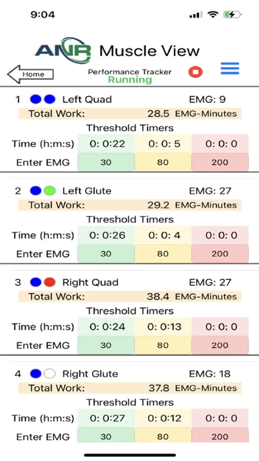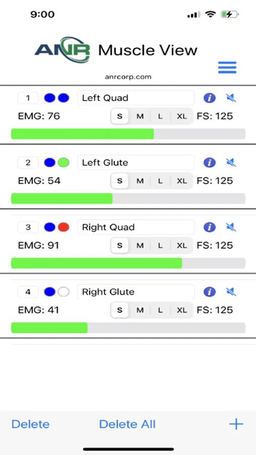 Display EMG reading (muscle activation level) from M40 Muscle Sense wearable EMG muscle sensors (by ANR Corp). Uses Bluetooth for device connections. Monitors the muscle activation level both numerically and with configurable bar graph. Supports up to 6 devices simultaneously. Features include: graphing, logging, data export, muscle performance profiling, and biofeedback (audio and haptic).