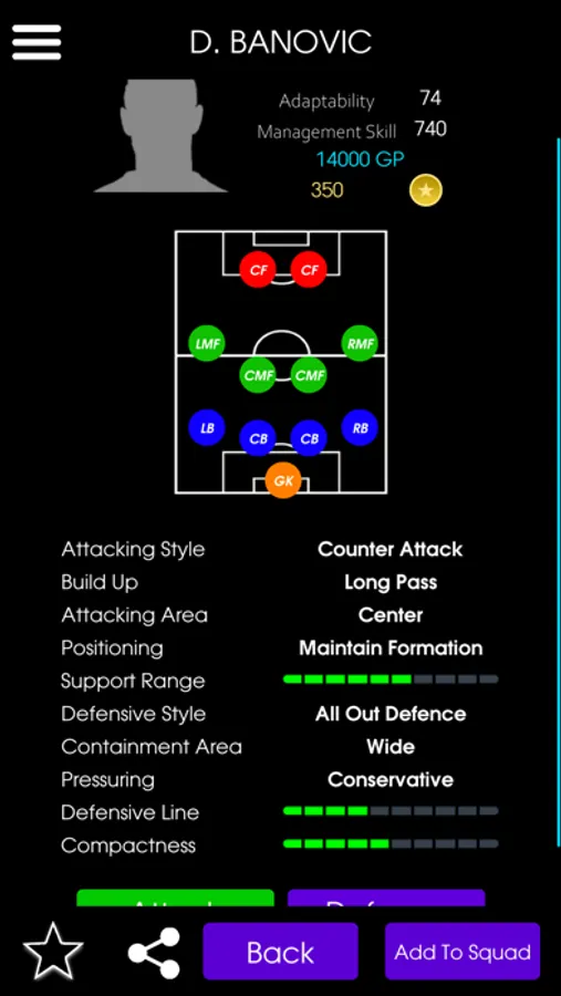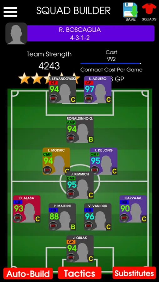 Build squads using players from the player database. The squad builder calculates team strength, ideal for building 2, 3 and 4 star teams. Squad builder also calculates the full teams contract renewal cost per game, allowing you to learn and understand how to build a squad with high team strength and low contract cost.