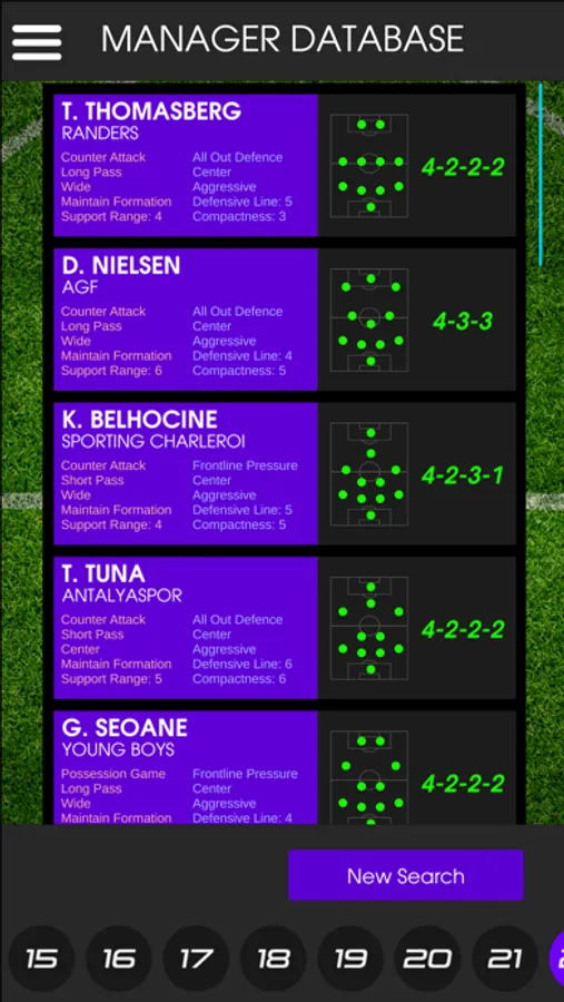 Featuring a manager database with search functionality showing each managers tactics and formations.