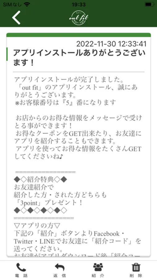 アウト フィットのアプリをSNSを通じてお友達に紹介する事ができます。