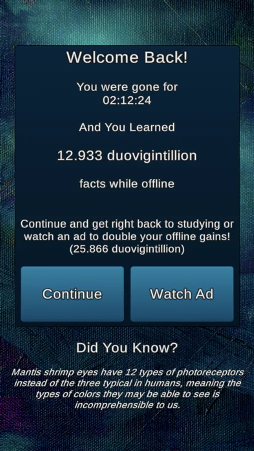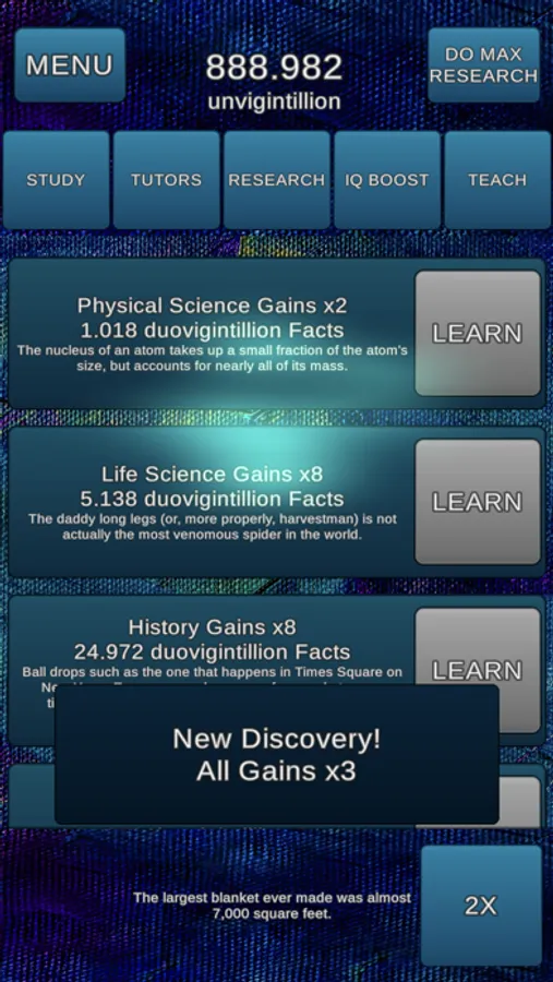 What if you woke up one day and could retain everything you ever learned? In Factoid, your character explores that question in the form of an incremental game. Your character will learn facts, conduct original research, and even boost their IQ as you progress! You can also play Factoid for as little as minutes at a time as your score will continue to accumulate even while you’re offline!