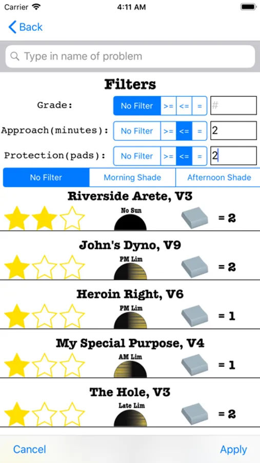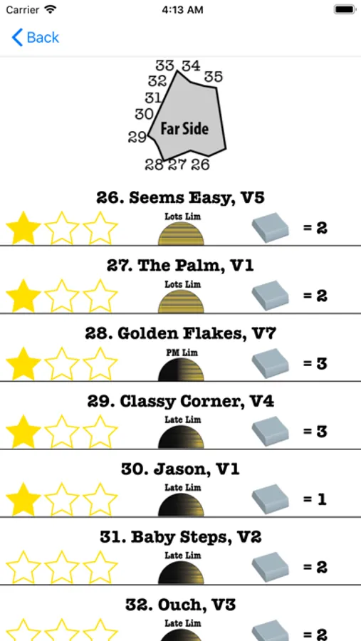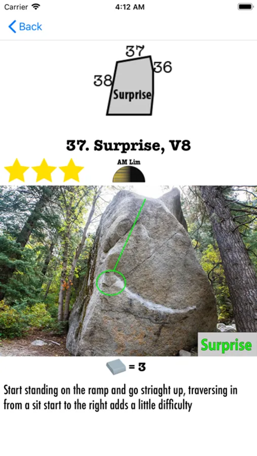 The interactive LCC bouldering guide allows you to browse through LCC's areas, subareas, boulders, and problems. The area and subarea overviews are extremely detailed and will help you to quickly find the problems you want to climb. The problem descriptions also include lots of useful info for boulderers such as how many pads are need for the boulder, what type of boulder it is, when sun is on the boulder, and more. The problem search feature also allows users to quickly find problems according to their custom filters. There is also circuits for each area to challenge users and help them with getting those high volume days!