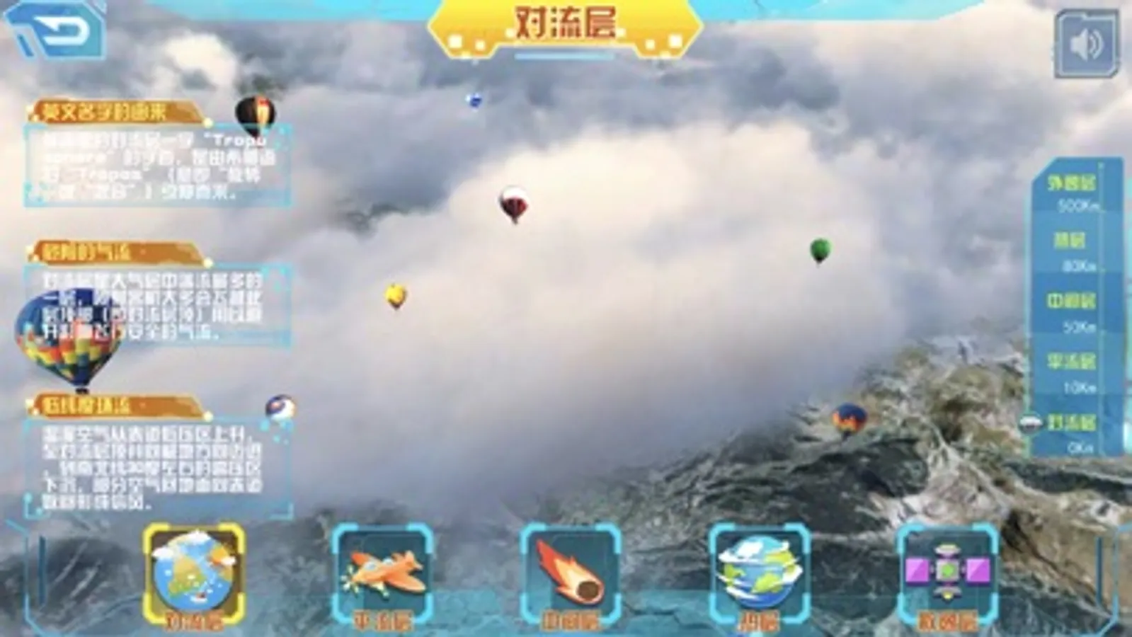 我们利用最新的VR技术,向小朋友们呈现了地球意外大气层中的景象,平流层的飞机,对流层的热气球,散逸层的宇宙,哇哦,好酷炫哦!