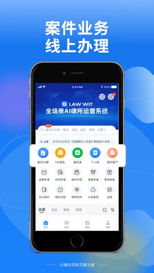 LAW WIT 是由上海律舟信息科技有限公司自主研发的移动、数字化、智能应用软件。该软件通过对传统律师行业需求的深入分析和对未来律师行业数字化需求的准确把握,打造了律师智慧办公、数字化运营、新一代智慧OA等多种功能。该软件旨在“让科技服务法律”,通过大数据的积累和分析,完成对律师业务的支持以及运营效率的提升。