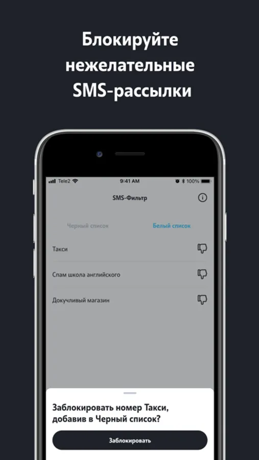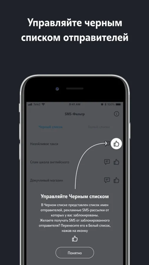 Особенность работы сервиса заключается в интеллектуальном алгоритме, который сам блокирует надоедливый трафик, без необходимости ручного заполнения списка заблокированных номеров. Функции приложения предусматривают просмотр списка имен отправителей, от которых пришел спам, с возможностью перемещать их между белым и черным списком для блокировки или разрешения получения SMS от выбранного отправителя. При этом имеется возможность просмотреть список заблокированных SMS, чтобы не упустить ценную информацию.