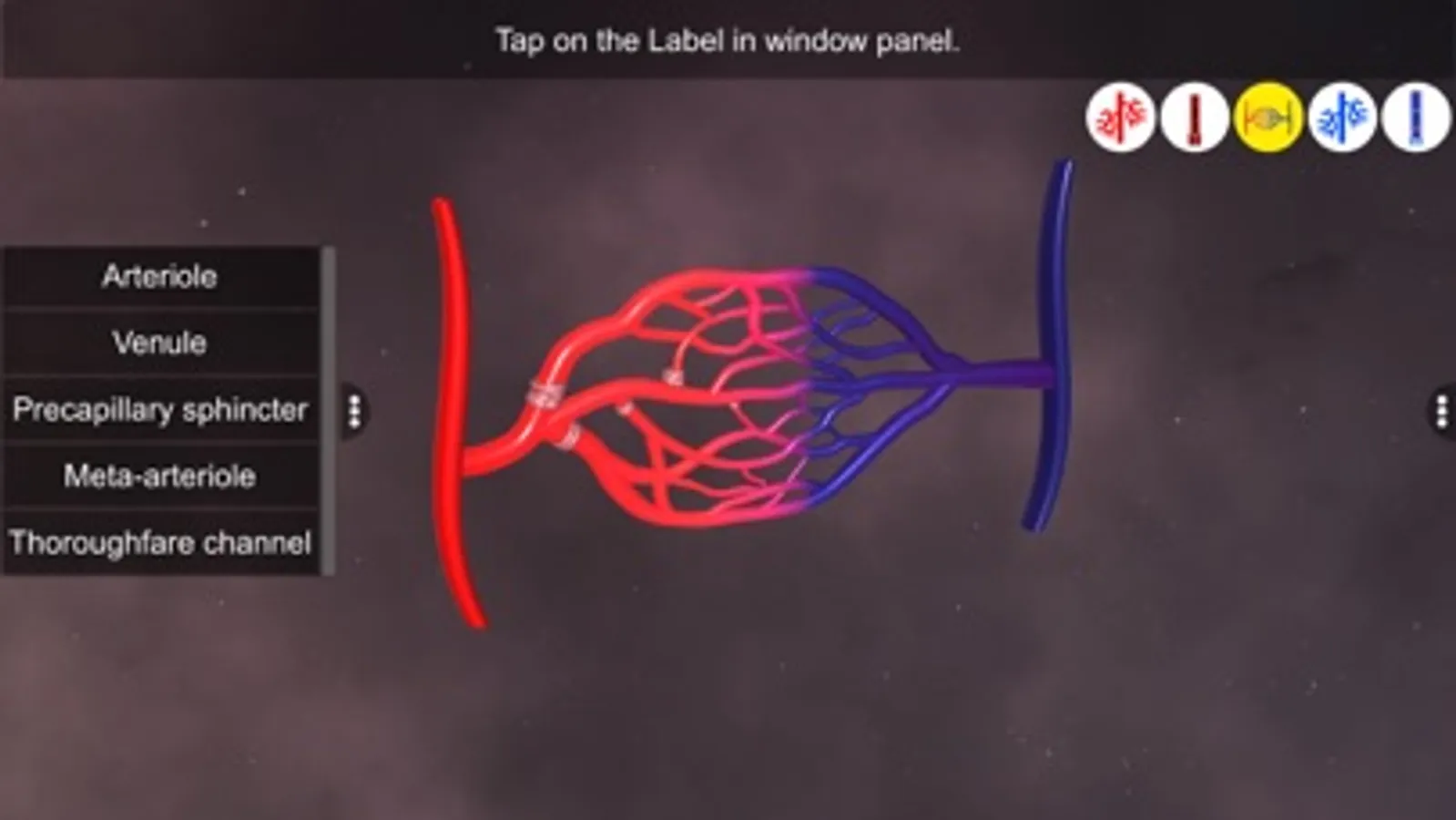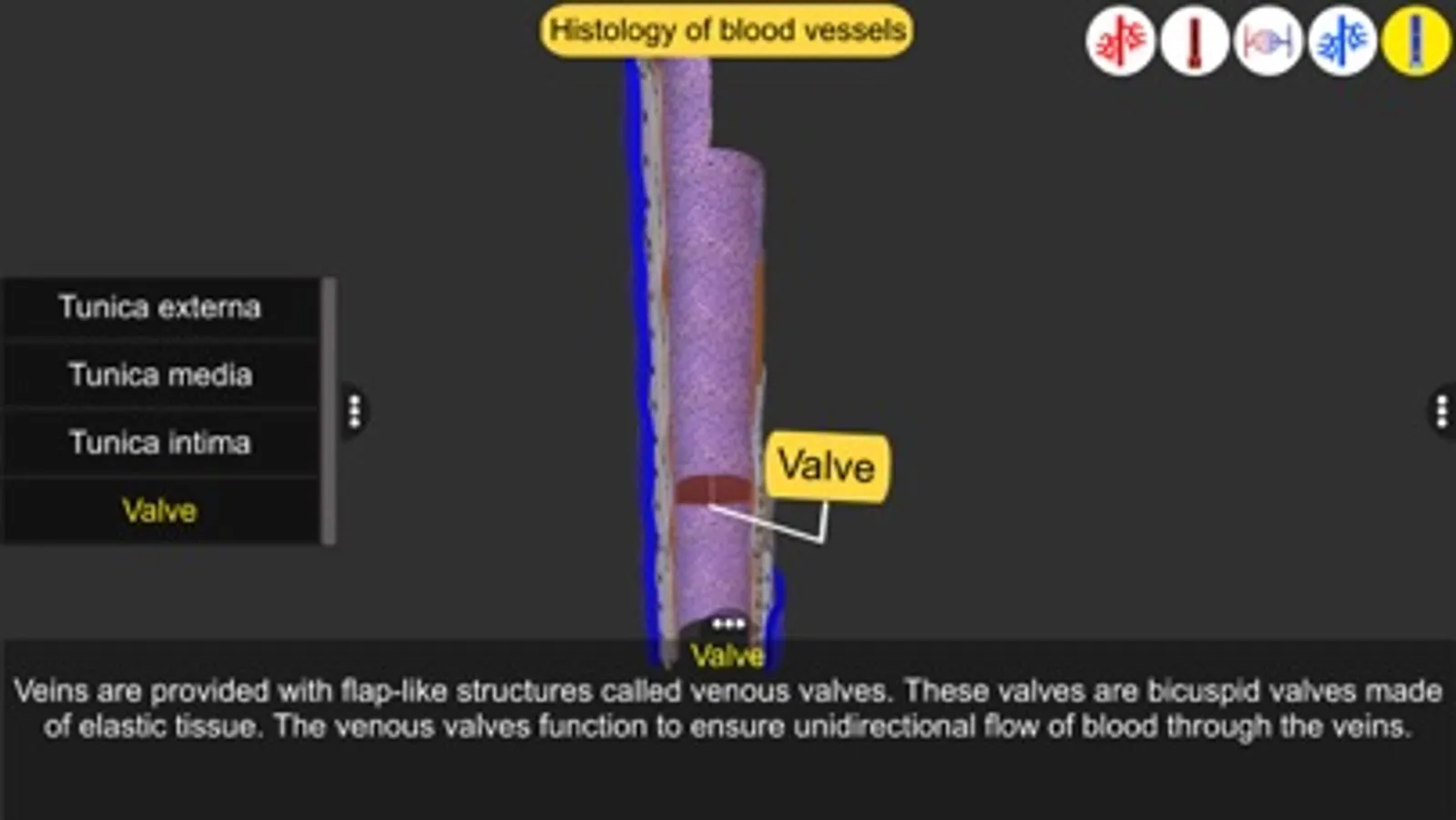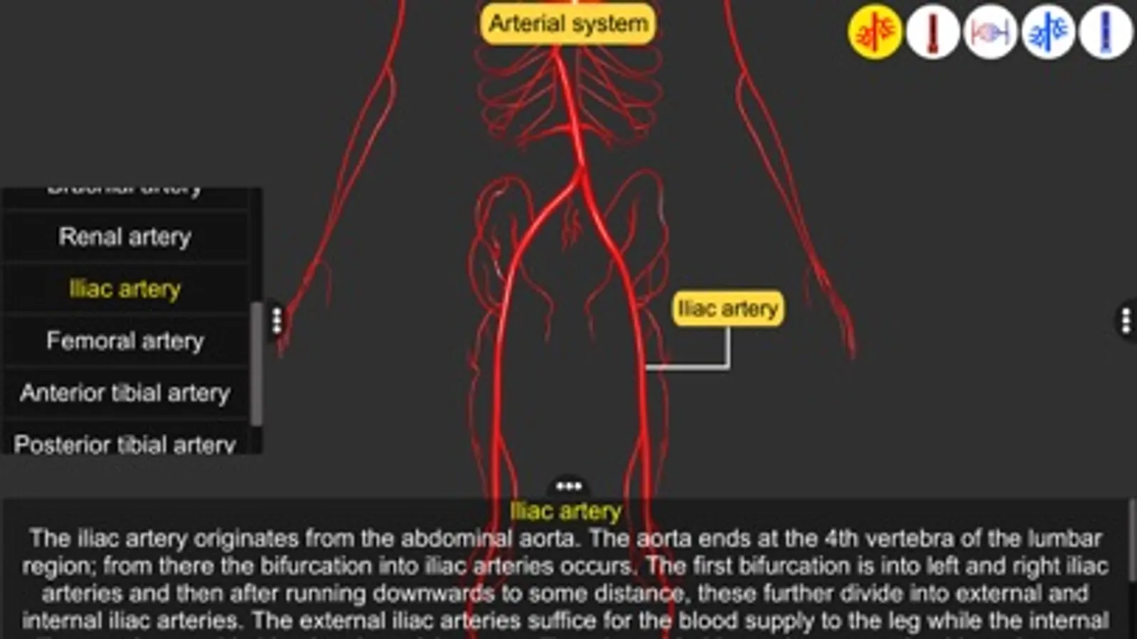 'Vascular system’ app explains in detail about the arterial system, the venous system and the capillary network. It covers the details of the different arteries, different veins and their structural anatomy. The 'Vascular system’ app also explains the anatomy of the region where the finer branches of arteries - the arterioles transit into capillaries and the capillaries join to form the venules which then combine to form the veins.