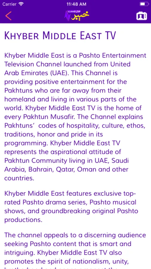 The channel appeals to a discerning audience seeking Pashto content that is smart and intriguing. Khyber Middle East TV also promotes the spirit of nationalism, unity, brotherhood and peace amongst the Pakhtuns.