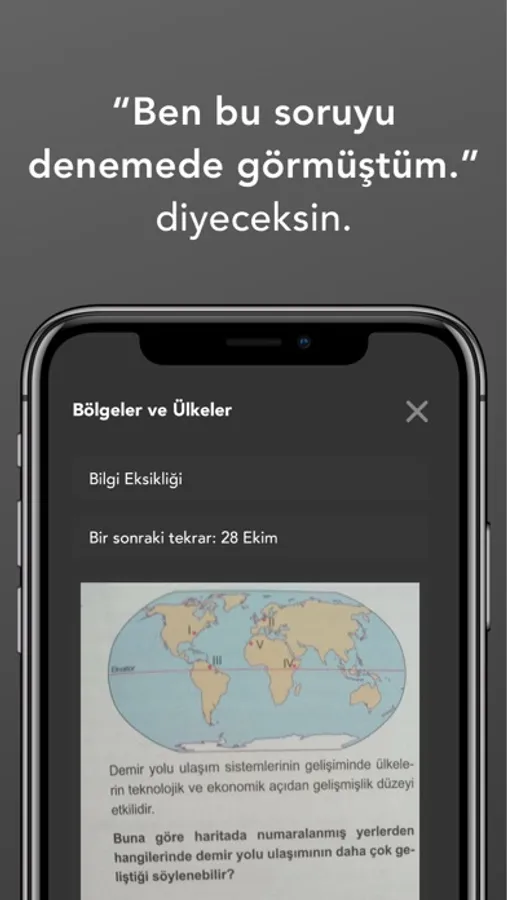 Bir bilgiyi zihnimizde yeniden ziyaret etmediğimizde o bilgi unutuluyor. O yüzden belirli aralıklarla tekrar yapman çok önemli. Bu yüzden Deneme Hafızası uygulaması her önemli YKS sorusunu uygun aralıklarla tam 5 kere tekrarlatıyor. Bir soruyu 5 kere tekrar ettikten sonra unutur musun sence?