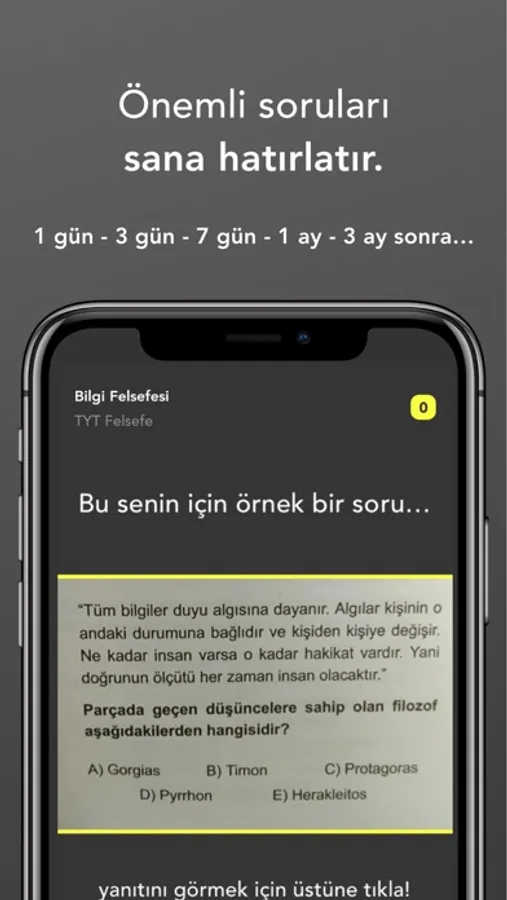 Soruyu ekledikten hemen 1 gün sonra, 3 gün sonra, 7 gün sonra, 1 ay sonra ve 3 ay sonra... Telefonuna senin istediğin saatte bildirim gönderiyor ve bu soruları sana tekrar ettiriyor. Psikoloji biliminde bu tekniğin adı "Spaced Repetition" yani "Aralıklı Tekrar", internetten araştırabilirsin.