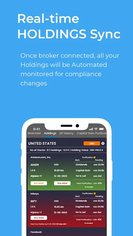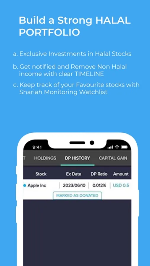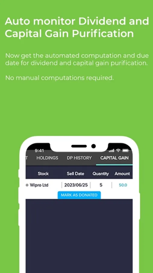 Automated Purification Value Calculation: Islamicly app includes a feature that accurately calculates purification values for your dividends as well as for capital gains (if applicable). This is the most important feature of a Shariah compliant portfolio, where the impure income portion needs to be given to charity. This calculation assists users in determining the purification amount seamlessly