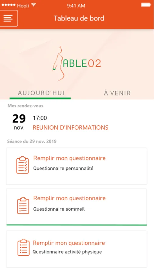 Au cours de l’étude, l’application ABLE02 vous proposera de compléter des questionnaires à distance sur différents aspects : qualité de vie, fatigue, activité physique, qualité du sommeil etc. Vous pourrez également contacter l’équipe de recherche à tout moment pour poser des questions.