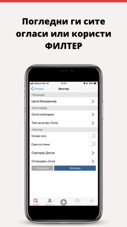 - Пребарувај по локација, категорија, тип на оглас, огласувач, датум и цена