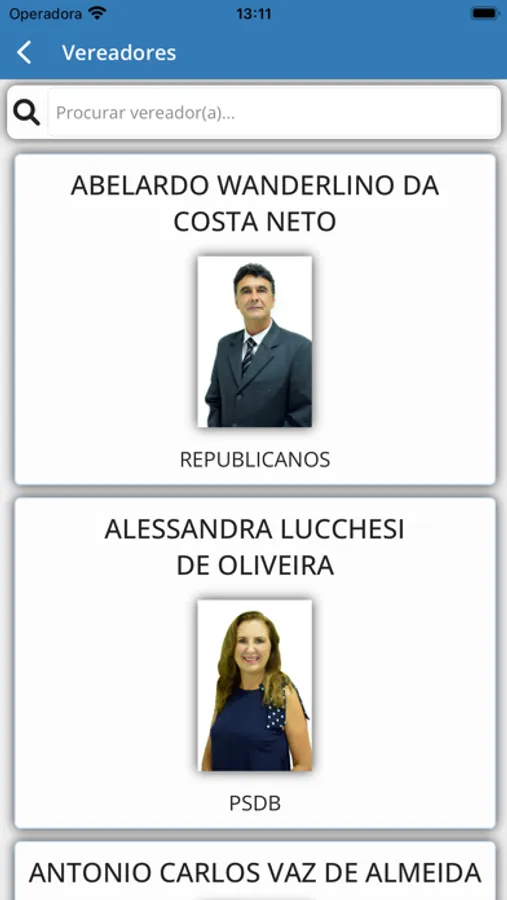 • Consulta a listagem dos Vereadores em exercício, exibindo o nome, partido, e-mail, telefone, links para proposituras apresentadas, frequência nas sessões e votos nominais;