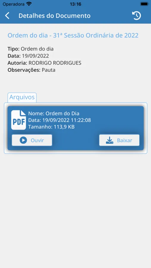 • Consulta aos documentos de sessão(Pautas e Atas da Ordem do Dia), mostrando as seguintes informações: número da sessão, tipo da sessão, data e hora da reunião e observações, texto da mesma, e tramitação.
