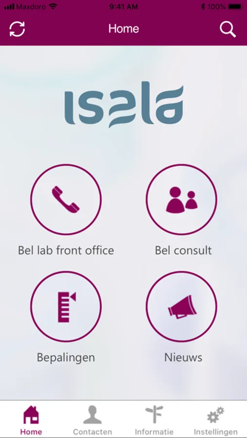 De app heeft op het beginscherm een knop waarmee de gebruiker direct kan bellen voor een consult. Ook kan de gebruiker binnen twee stappen direct contact leggen met verschillende contactpersonen.