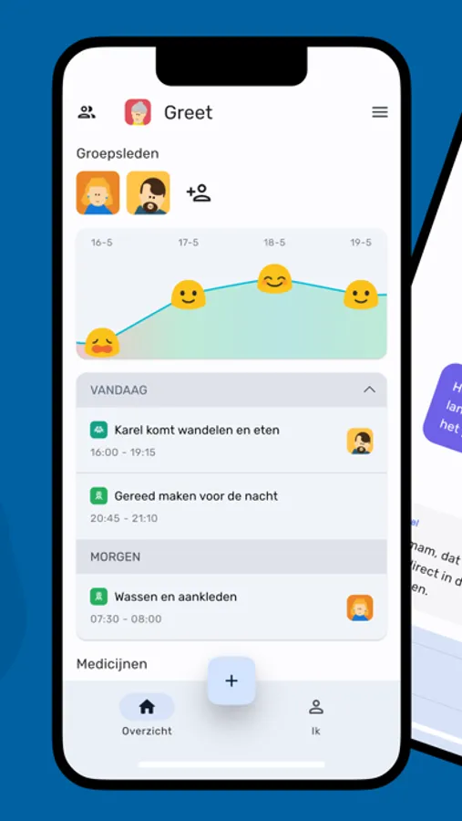 Om onderling eenvoudig contact te houden en te overleggen, hebben we een chat en agendafunctie in de App opgenomen. Alle leden van de groep die daartoe rechten hebben kunnen dan de chats lezen. Als je een nieuw lid in de groep toevoegt, kan die ook de oudere chat berichten zien zodat die snel op de hoogte is van alle ontwikkelingen. Met de gedeelde agenda is eenvoudig te zien welke afspraken er staan en wie er mee gaat!