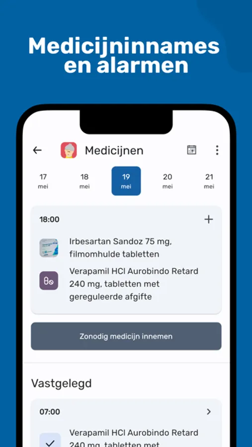Met de medicijnhulp kan je eenvoudig herinneringen ontvangen wanneer het tijd is om de medicijnen in te nemen en te zien of ze al genomen zijn. Medicijnen kun je toevoegen aan de hand van de RVG-code van het medicijn. Als deze code door de App wordt herkend wordt de medicijnnaam, ATC en werkende stof automatisch ingevuld. Uiteraard kan ook worden gezocht op de naam van het medicijn.