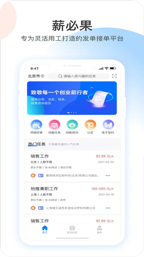 薪必果是一个专为灵活用工打造的发单接单平台,用人单位发布招工信息,供应商发布供人信息,每天更新全国各地的项目信息,帮助用工单位和工头们快速匹配需求,达成合作互利。