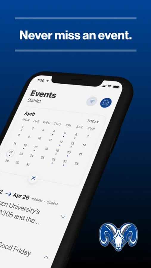 The event section shows a list of events throughout the district. Users can add an event to your calendar to share the event with friends and family with one tap.