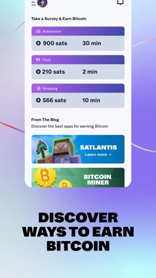 First things first, download the app and dive into a world of endless possibilities. Take surveys, play games, have fun, interact with your friends — all of this while you earn Bitcoin!