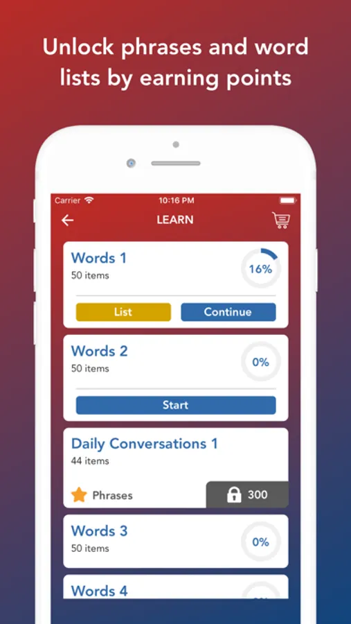 - Earn points by learning and practicing. Then unlock phrases and word lists.