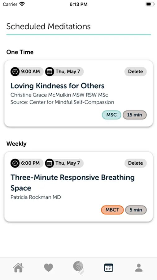 - Schedule meditations for yourself and receive a notification when it’s time to meditate. This can be done daily, weekly, monthly or one time
