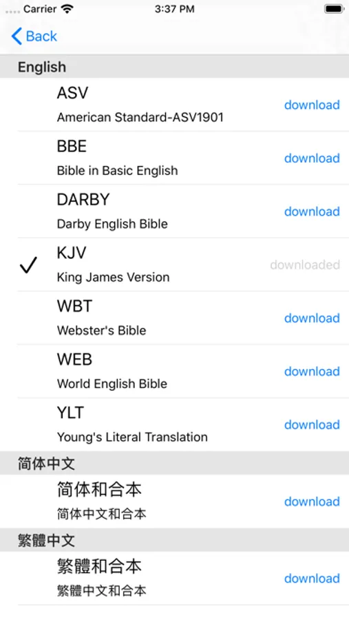 * Multiple bible translations: KJV, WEB, 和合本 and more.