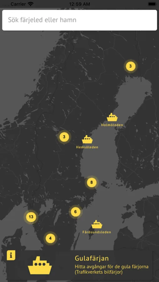 Denna app är utvecklad för att göra det lite enklare att veta om hur lång tid färjan går. Alla Trafikverkets gula bilfärjor och vägfärjor finns med här. Du kan söka färjeled eller välja på kartan.