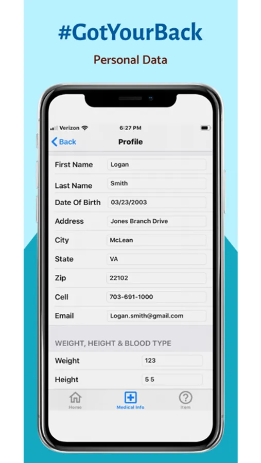 Store and access your medical information at any time. Enter personal data into fields such as blood type, height and weight, medications, and dosage.
