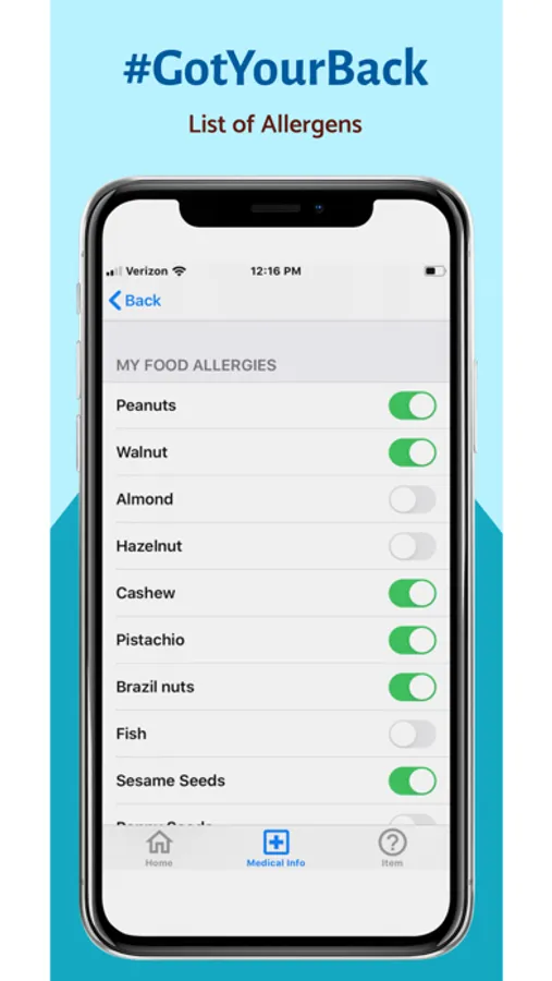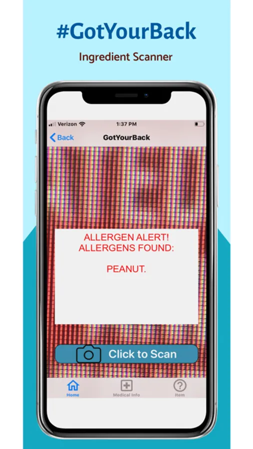 #GotYourBack is an all-in-one food allergy management iOS app that stores allergens, medical information, scans food labels, and uses geo-location to notify emergency contacts if an emergency occurs.
