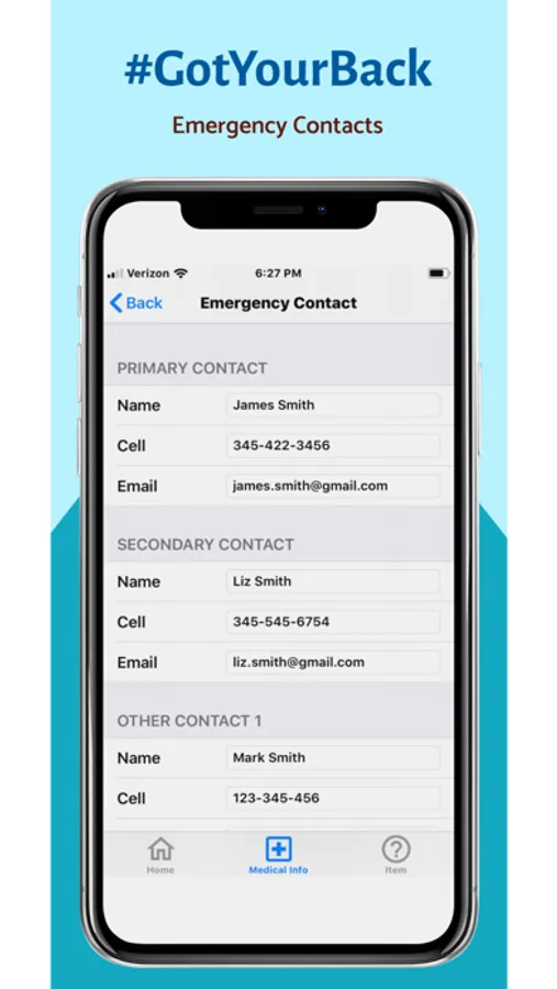 Input information about your emergency contacts into the required text fields. This information will be used in the emergency feature, where your emergency contacts will be sent a message with your location if an emergency occurs.