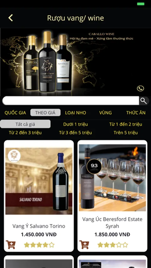 Trang chủ: Xem và tìm kiếm rượu theo quốc gia và tên rượu vang, cho phép thêm vào giỏ hàng và xem chi tiết sản phẩm, chia sẽ, xem và đánh giá sản phẩm.