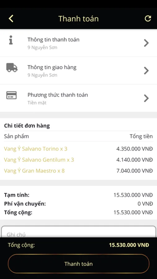 Giỏ hàng: Cho phép xem các mặt hàng đã thêm vào giỏ, ghi chú , tổng tiền thanh toán và đặt giao hàng.