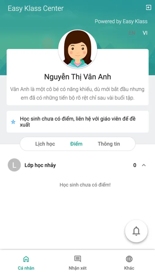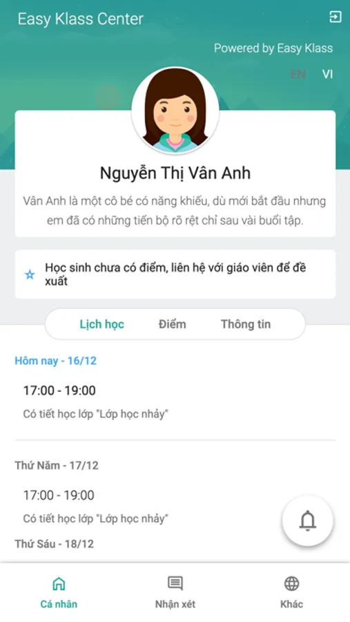 - Xem và nhận thông báo về lịch học, thông báo từ trung tâm