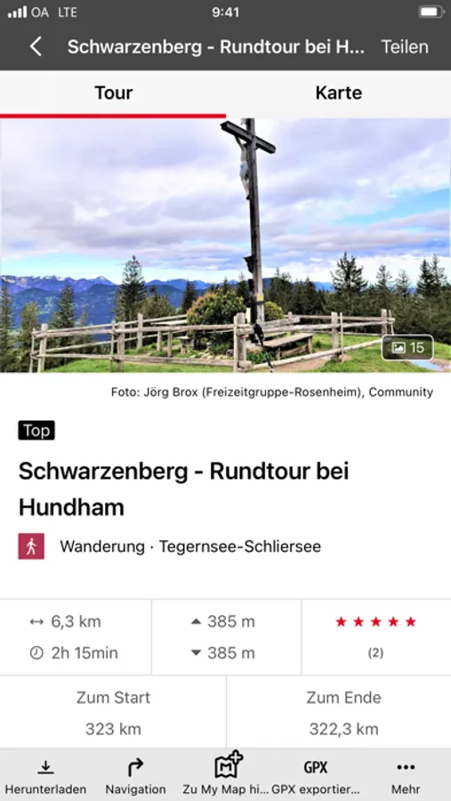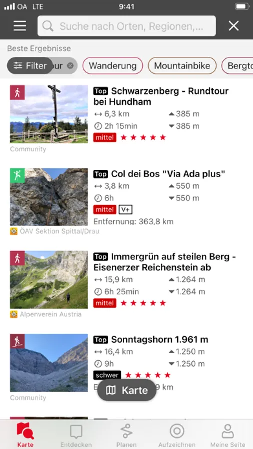 Stöbere in unzähligen Tourenvorschlägen – z. B. zum Wandern, Radfahren und Skitourengehen. Alle Touren sind mit vielen Details, Höhenprofil, Fotos und Wegbeschreibung verfügbar.