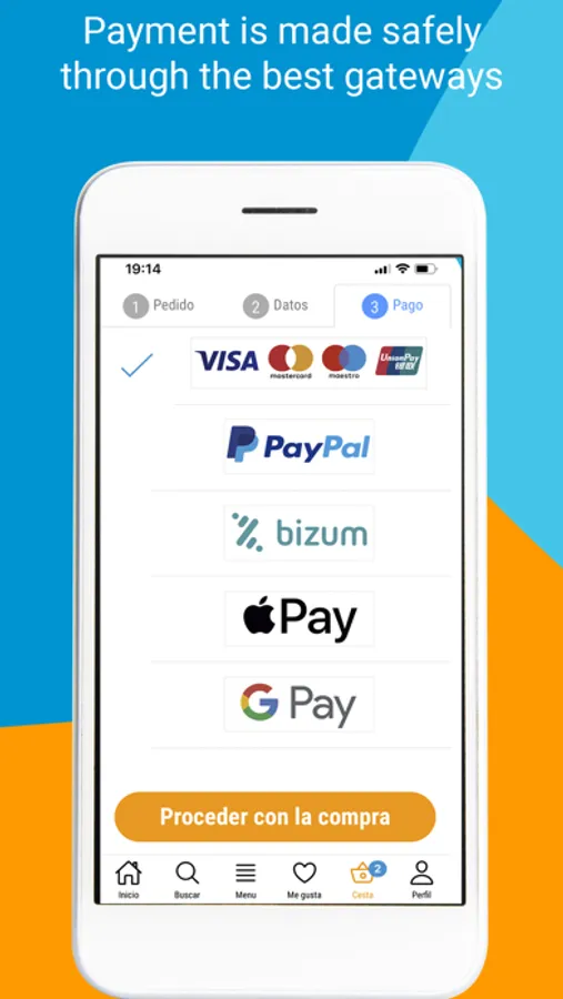 - Payment options in all existing electronic platforms in a secure way (Paypal, Bizum, Bank card, Apple Pay, Google Pay)