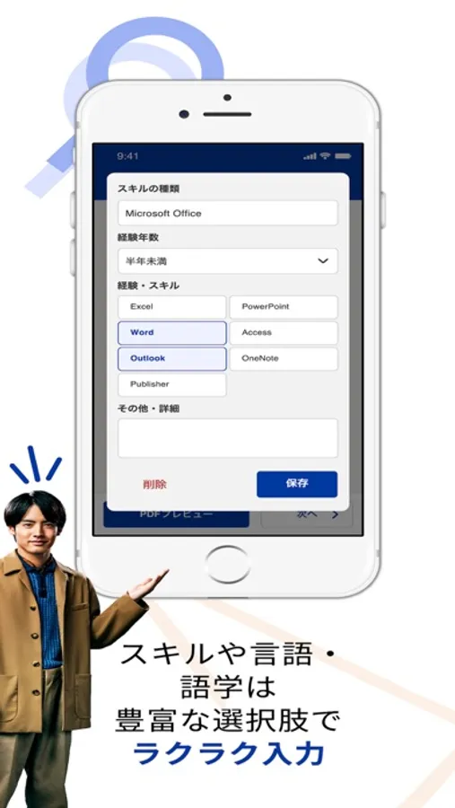 手動で入力すると面倒な活かせるスキルや言語・語学の選択肢を豊富にご用意!