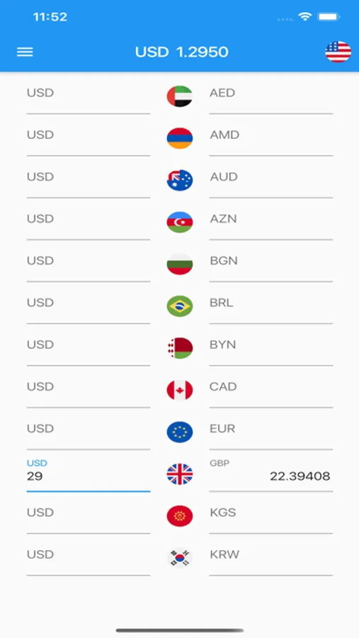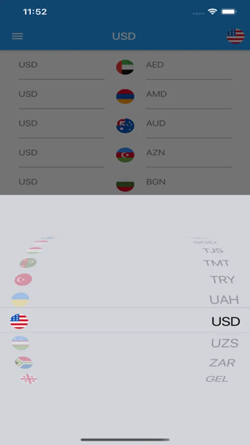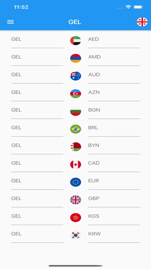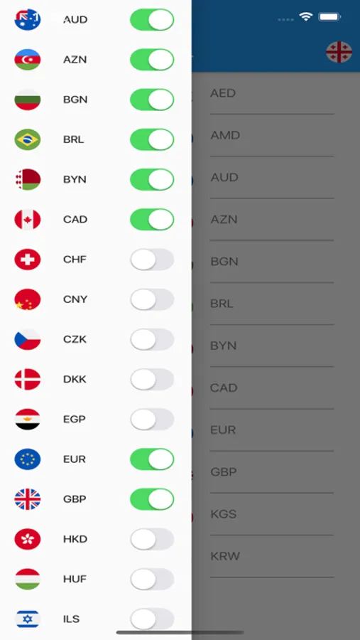USD, EUR, GEL, GBP, RUB, AED, AMD, AUD, AZN, BGN, BRL, BYN, CAD, CHF, CNY, CZK, DKK, EGP, HKD, HUF, ILS, INR, IRR, ISK, JPY, KGS, KRW, KWD, KZT, MDL, NOK, NZD, PLN, QAR, RON, RSD, SEK, SGD, TJS, TMT, TRY, UAH, UZS, ZAR.
