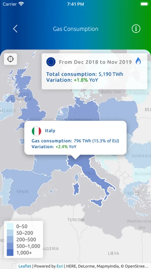 - Energy Consumption: on an interactive European map you can view how much energy each European country has consumed in the last months.