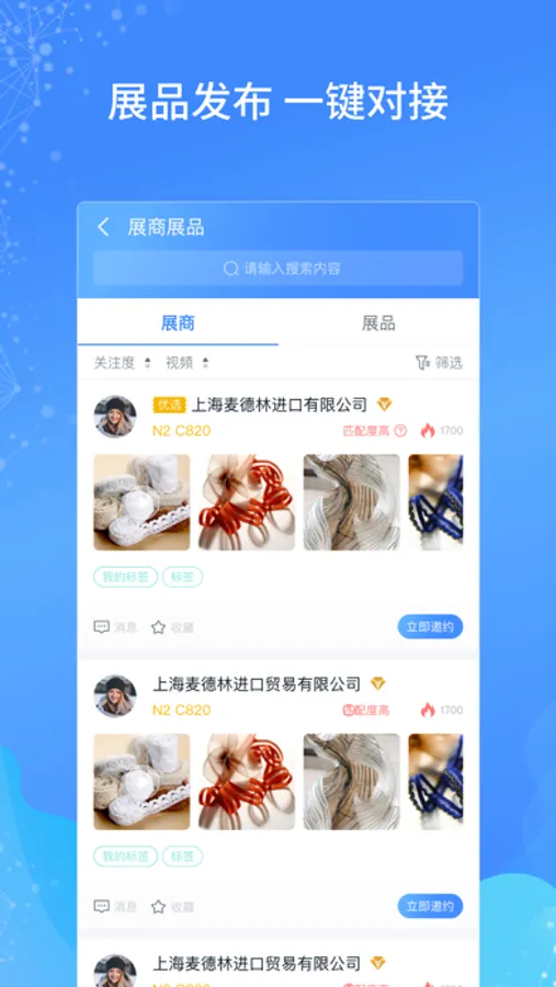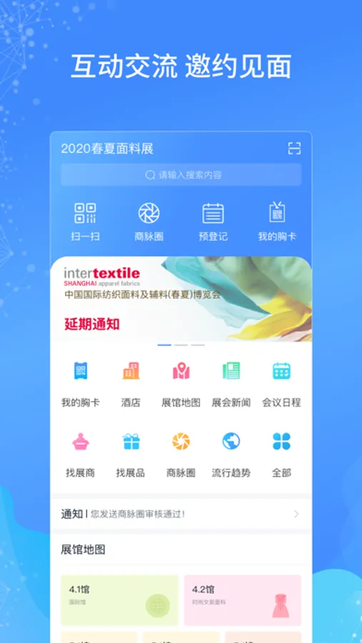 “i展通App”展会行业移动客户端电子商务APP,为参观参展各方实现获知资讯动态、洞察商机趋势、匹配撮合约见、高效营销互动等需求的展会服务平台。