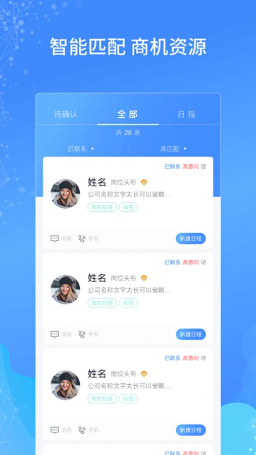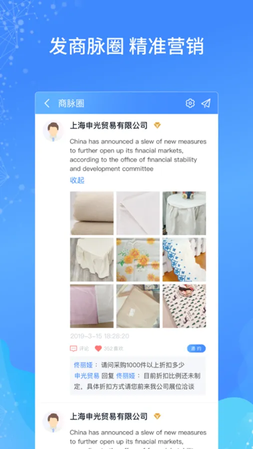 【1】发布商脉圈/寻找客户/寻找货源/即时通讯/推荐客户/邀约客户/行程单,强大功能一站式体验,无限商机不容错过。