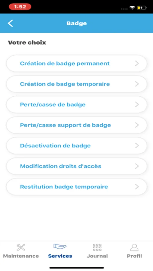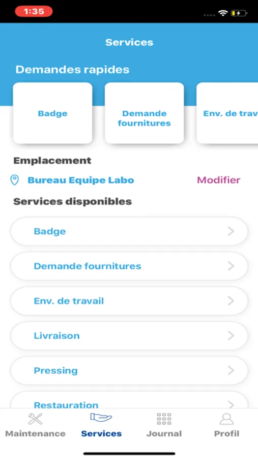 • Création d'une demande d'intervention ou de services en 4 étapes (avec ou sans scan du QR code d'une zone, d'un local ou d'un équipement)
