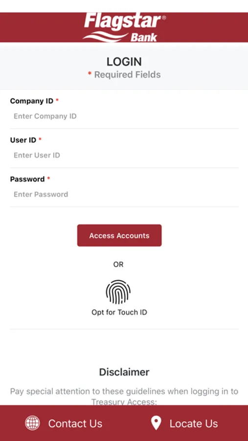 To get started, download and launch the app. Sign in using your Treasury Access Company ID, User ID, and password. You must be currently enrolled in Flagstar Treasury Access to use the mobile app.