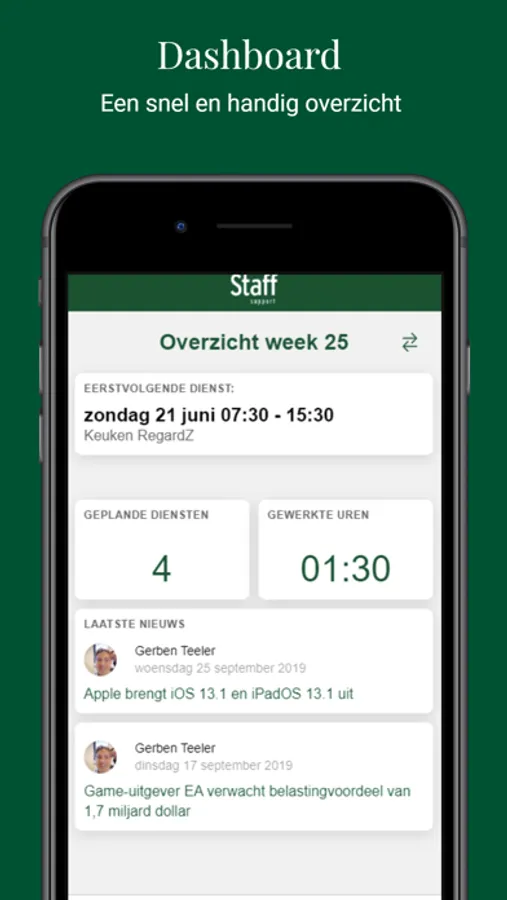 De Staff Medewerker app geeft je toegang tot alle informatie die je nodig hebt om je functie goed en volledig uit te voeren. Het dashboard geeft je bij binnenkomst direct alle belangrijke informatie die je nodig hebt. En dat met een nieuw en fris uiterlijk.